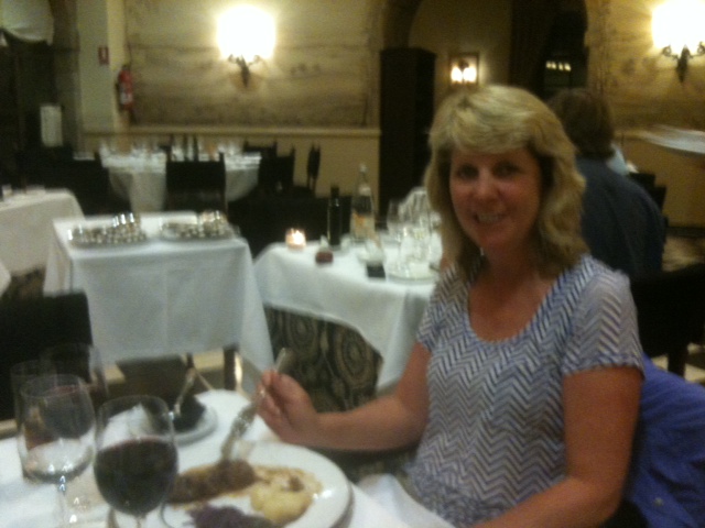 After a great nap, we had a lovely dinner at the Paradores. Kind of funny that a glass of wine costs the same as a coca cola light. Cheap for wine, expensive for coke! We figured out that while we were sitting in town we saw at least 25 of our peregrino friends. Some will continue on with us, some we will never see again. One peregrino who we don't know had her backpack stolen with her passport in it. Really sad, but it just shows that even though the Camino is sacred ground, you need to be careful. She was so disturbed by it, she headed for home. What a shame.